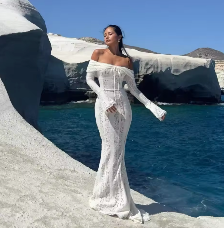 Off-Shoulder Maxi Dress with Flared Sleeves