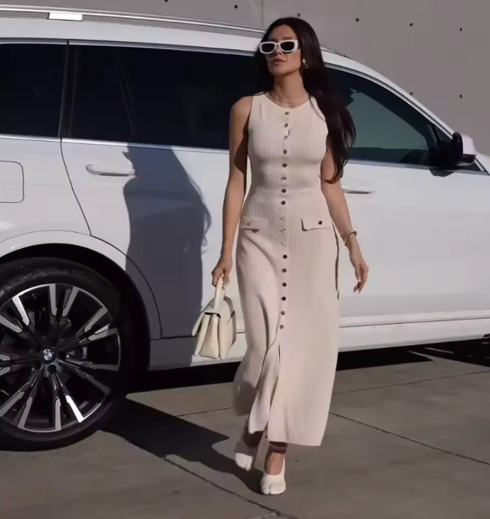 This women’s ribbed dress features a button-down front and a slim-fit silhouette.