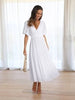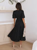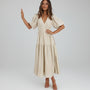 This midi dress features a tiered skirt and shirred waistband with a V-neckline.
