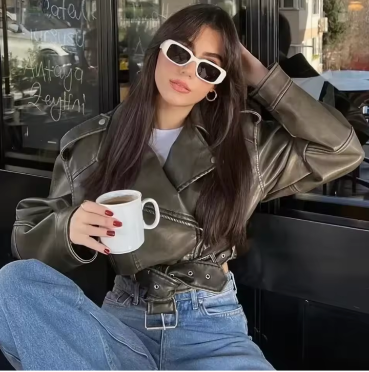 This jacket for women comprises a cropped silhouette with an asymmetric front zip and waist belt.