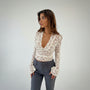 This sheer lace top for women features a scalloped plunging neckline and long flared sleeves.