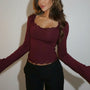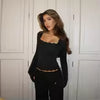 This square-neck top for women includes lace trim along the neckline and hemline.